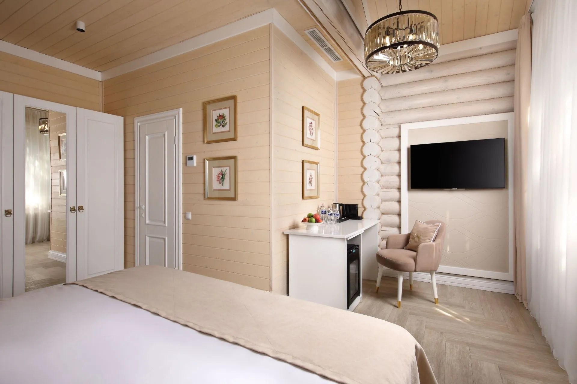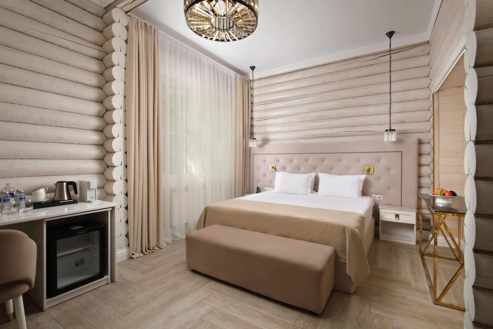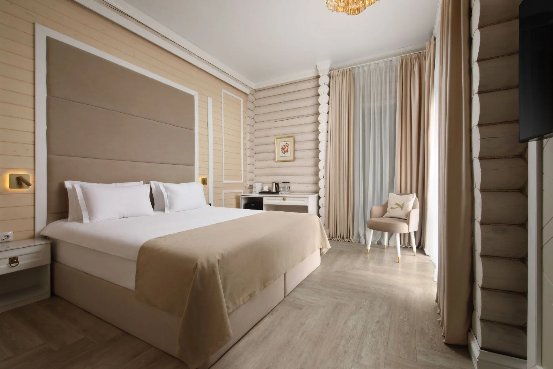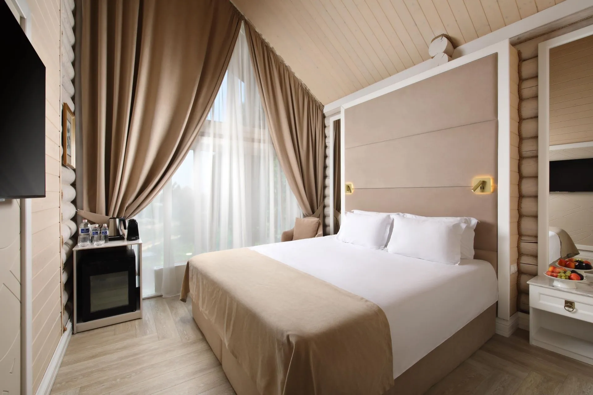 Идеальный выбор для тех, кто стремится к сочетанию бескомпромиссного комфорта с ноткой роскоши. Современная эстетика, эксклюзивные аксессуары, приятные тона и завораживающий вид на лес. Номер категории De Luxe — создан для взыскательных гостей, ценящих комфорт и удобство, простор и изысканность.
