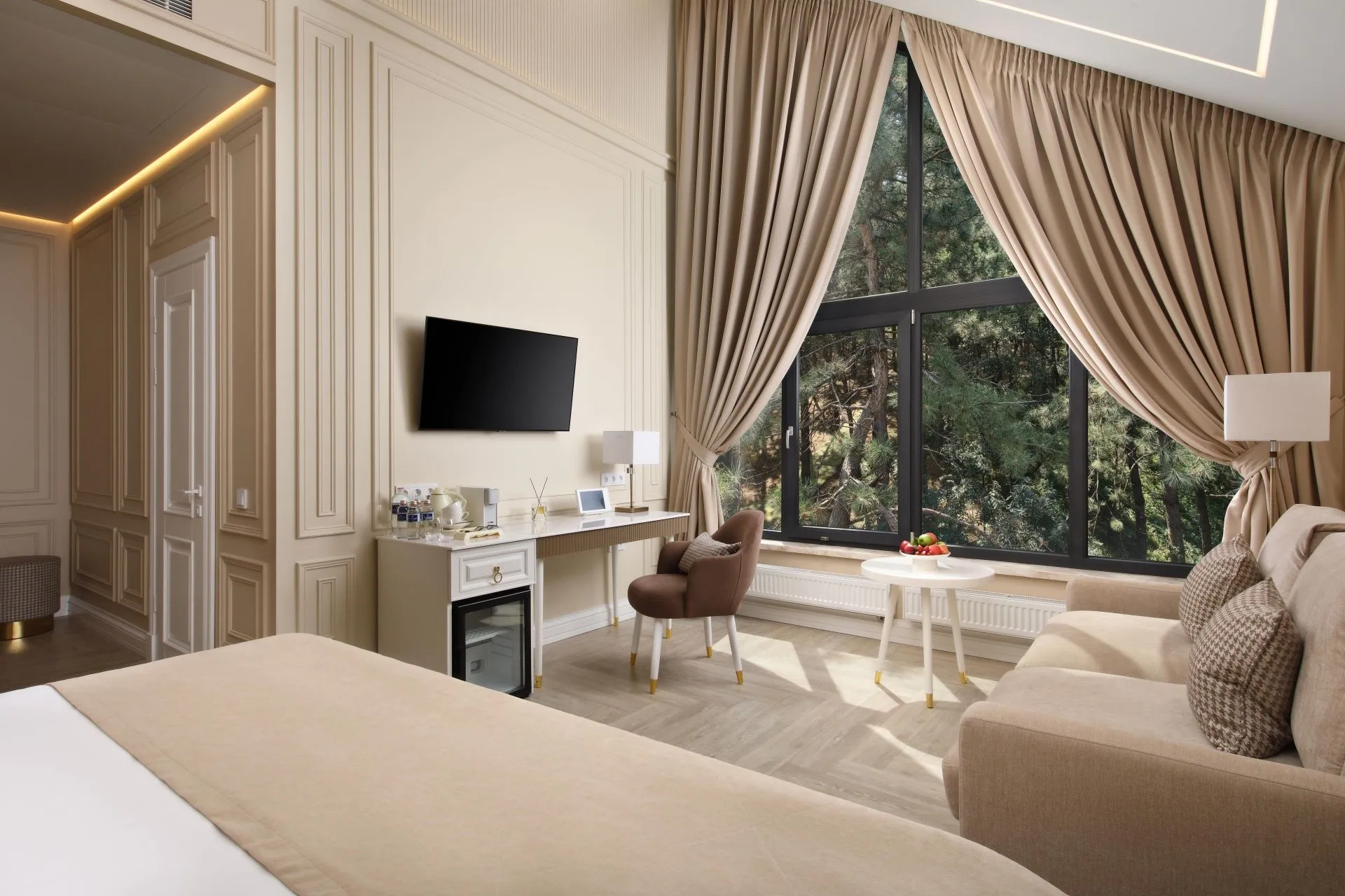 Идеально подойдет как для пар, так и для семейного отдыха. Просторный и комфортабельный люкс площадью 55 м2 с отдельной спальней, просторной гостиной и двумя ванными комнатами. Из панорамных окон номера открывается вид на лес. Дизайн номера выполнен в неоклассическом стиле и продуман до мелочей. Здесь вы найдете все необходимое для спокойного отдыха.